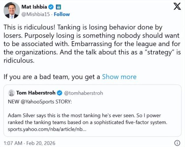 “这太荒谬了!摆烂就是失败者做出的输球行为,”伊什比亚写道。“故意输球是任何人都不该沾边的事。这对联盟、对这些球队来说都是耻辱。把这当成一种‘策略’来讨论,更是荒唐。”