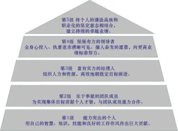 在柯林斯及其团队历时5年,花了15000个小时,从出现在世界500强排行榜上的公司中选择了11家实现从优秀到卓越跨越的公司进行共性研究提炼,总结出了第5级经理人这样一个人群的存在。他们是看似平凡、不事张扬却创造出了不平凡业绩的人。