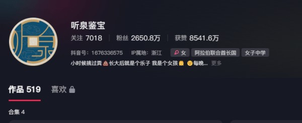 一方面,其庞大的粉丝群体为直播带货提供了强大的消费潜力。截至目前,听泉鉴宝的粉丝量已超过2600万,且粉丝群体涵盖了各个年龄段和不同兴趣爱好的人群,这意味着在选品上有更多的可能性,可以满足不同消费者的需求。
