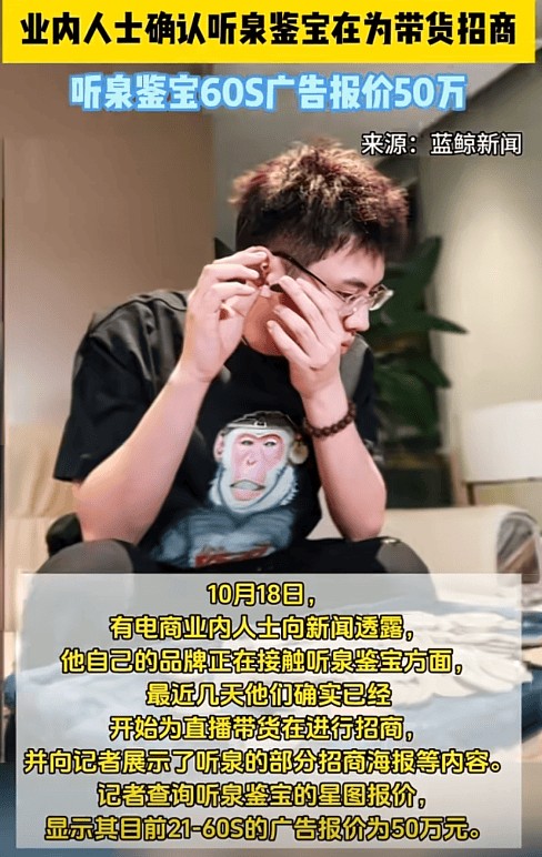 蓝鲸记者查询听泉鉴宝的星图报价,显示其目前21 - 60秒的广告报价为50万元。