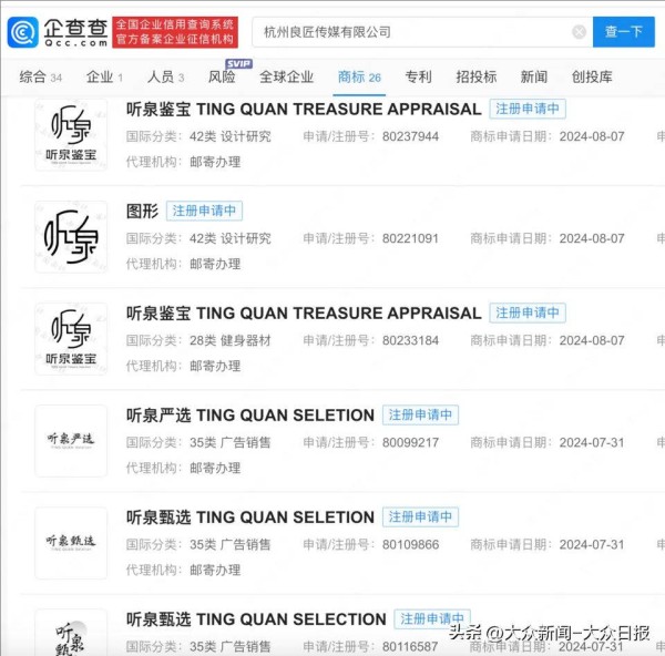 值得一提的是,丁祥栩持股49%的杭州良匠传媒有限公司已经申请注册了多枚商标,如 “听泉鉴宝”“听泉严选”“听泉甄选”等。这些商标的国际分类涉及广告销售等领域,目前商标的状态均处于注册申请阶段。
