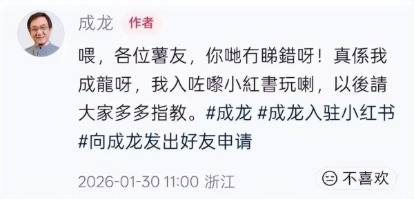 2026年1月30日,成龙开通了小红书账号,并在当日发布了首条视频。账号一经开通,便迅速吸引了大量关注者,视频上线短短几小时内,粉丝数量就显著增长。该账号简介着重强调了新用户身份,凸显出以积极姿态参与平台活动的决心。首条视频聚焦于自我展示,不仅分享了日常习惯,如健身练习、照料植物以及与宠物互动等,还融入了过去电影中的片段,像在项目里出现的场景和动作序列。