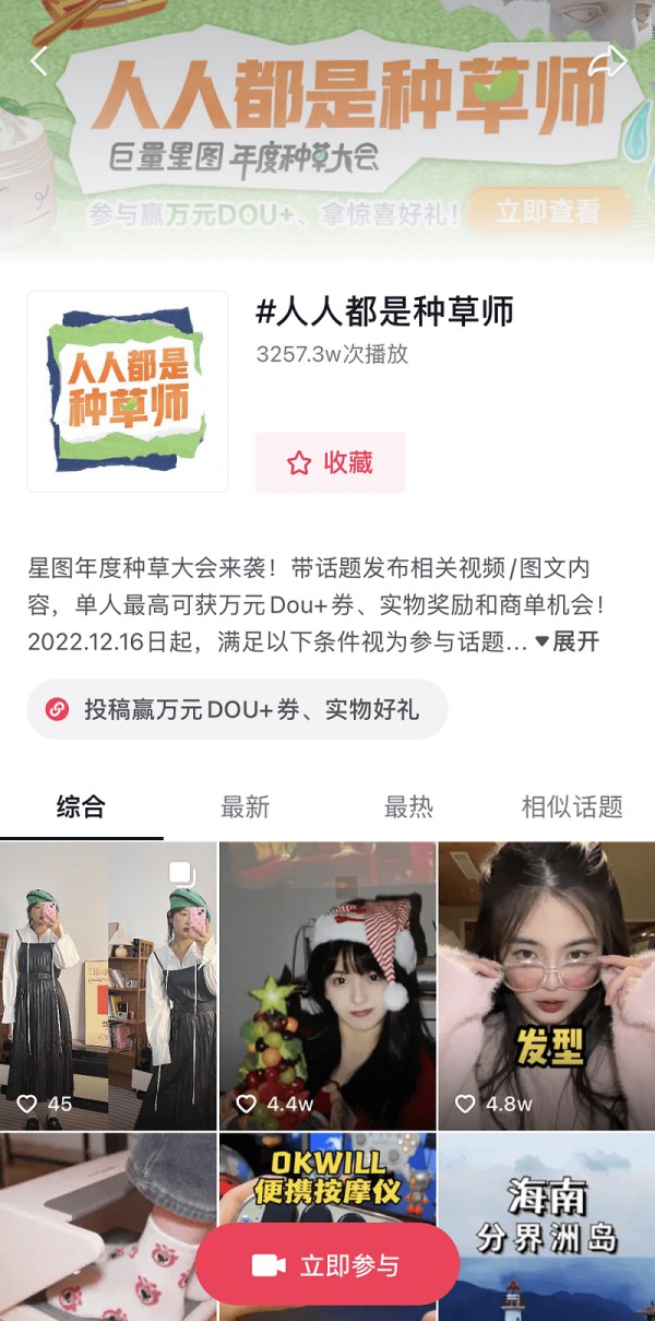 在种草大会活动期间,各品类种草达人领衔参与,为用户种草好物。广大用户也可报名“人人都是种草师”花式话题挑战赛,无论是时尚穿搭、美食还是亲子萌宠赛道的创作者,都可以花式种草好物,还有机会赢取种草激励。