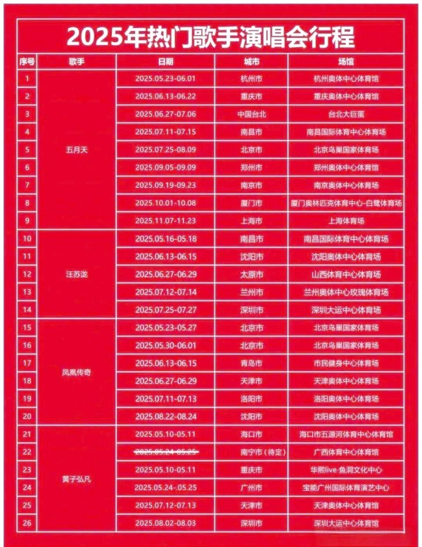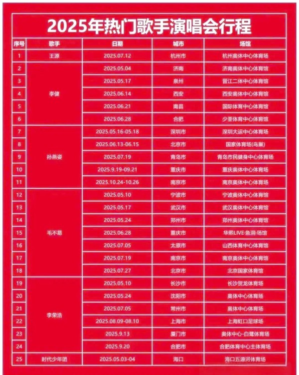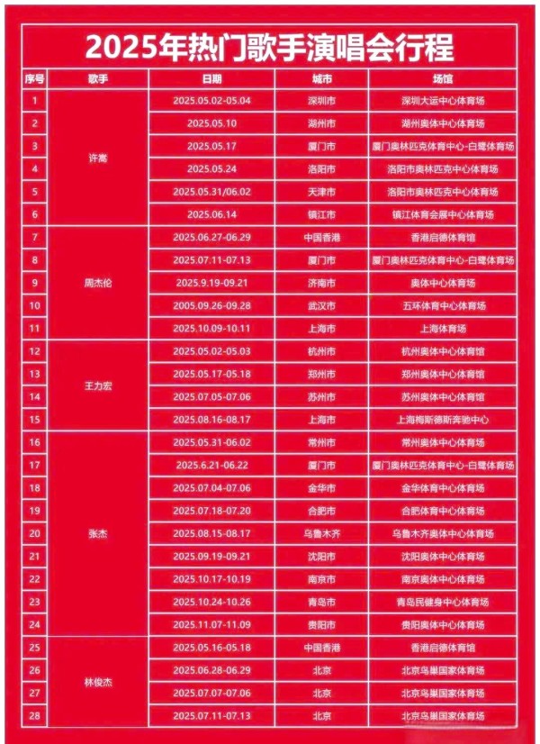 接下来,让我们一起看看2025年热门歌手的演唱会行程安排: