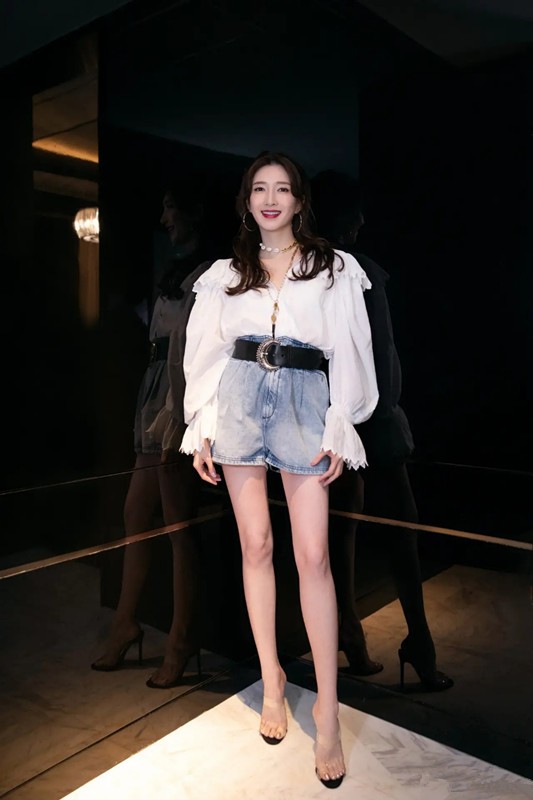 江疏影的这一套蓬蓬袖可爱长袖衫搭配高腰的牛仔短裤,超宽的腰带突出腰部的曲线美,短牛仔突出了大长腿的美感和笔直,透视高跟鞋是点睛之笔。突出脚面的立体感。