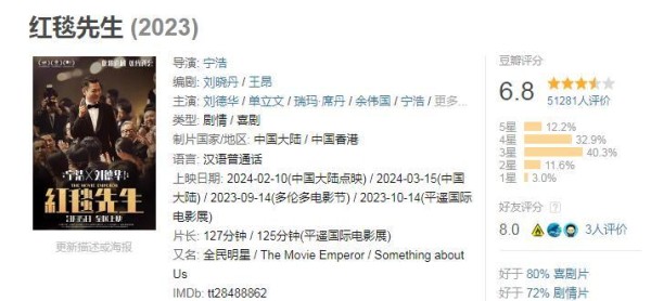 一方面,电影《红毯先生》的豆瓣评分仅为6.8分,几乎是春节档中评分最低的一部。观众怀着对宁浩喜剧的期待来看这部电影,却感受到了相当大的心理落差。影片在票房宣传中被宣称为“优雅喜剧”,实际上与宁浩一贯擅长的黑色幽默和关系错位的笑点相去甚远。电影的节奏较为缓慢,缺乏爆笑喜剧的元素,甚至在暴打投资人的高潮场面中也更像是欧洲电影的荒诞表现,而非宁浩喜剧的过瘾之作。