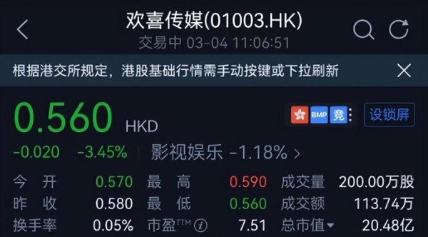 当《红毯先生》宣布撤档时,欢喜传媒的股价下跌至0.58元,随后陷入困境。截至目前,欢喜传媒的股价已降至0.56元,比宣布撤档时进一步下滑。