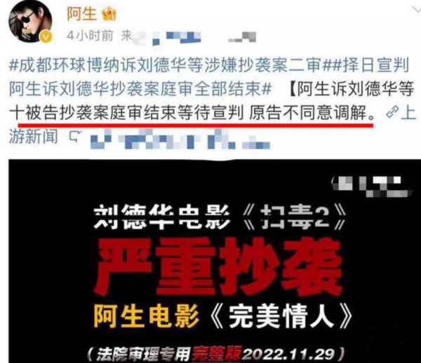 整个瓜就是刘德华主演的某部电影,被这位叫做阿生的人告了,说是这部片抄袭了自己之前导的一部片。