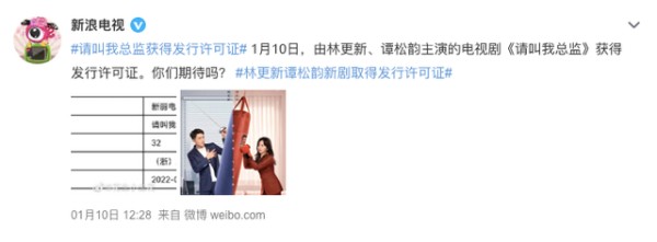 近日,林更新、谭松韵主演的《请叫我总监》获得发行许可证,播出指日可待。