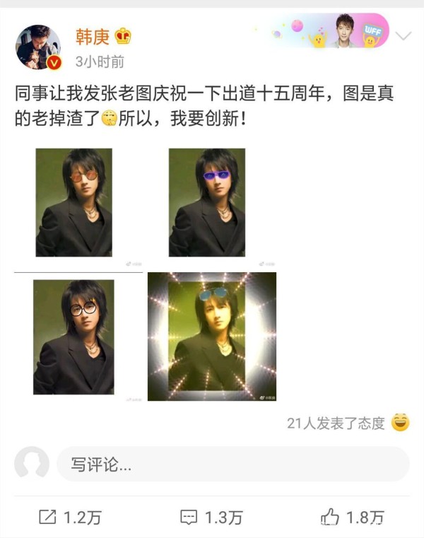 就在近日,韩庚突然晒出了一组旧照,并庆祝自己出道整整15周年,虽然粉丝都在拼命的吐槽:“韩庚这些照片真的是老的掉渣”,但是韩庚现在依旧非常的帅,感觉时间并没有冲淡韩庚的魅力,反而让他更加的成熟。
