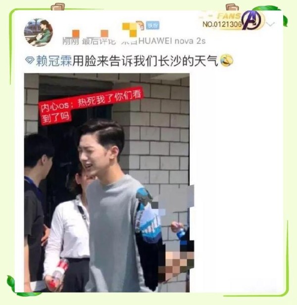 看到自家爱豆如此敬业地营业,粉丝们原本期待能感动到声泪俱下,至少也会有一波彩虹屁的称赞吧。然而,赖冠霖却因炎热而变得有些狼狈,甚至被粉丝调侃热到变形,还晒出了一张“丑照”并配文“赖冠霖用脸告诉我们长沙的天气”。这样的互动方式,真是别有一番趣味,也体现了粉丝们独特的爱意。
