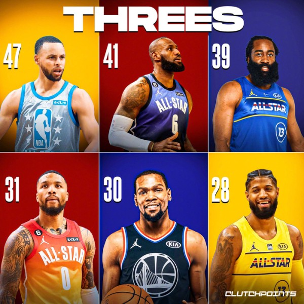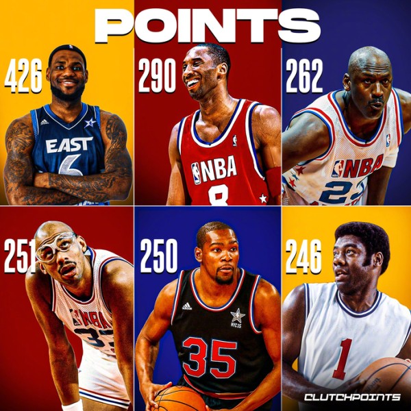 NBA全明星赛各项数据历史排行榜!老詹出场数第一、总得分第一!三分命中数前六均为现役!