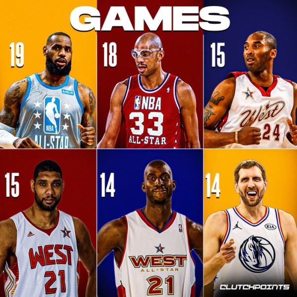 NBA全明星赛各项数据历史排行榜!老詹出场数第一、总得分第一!