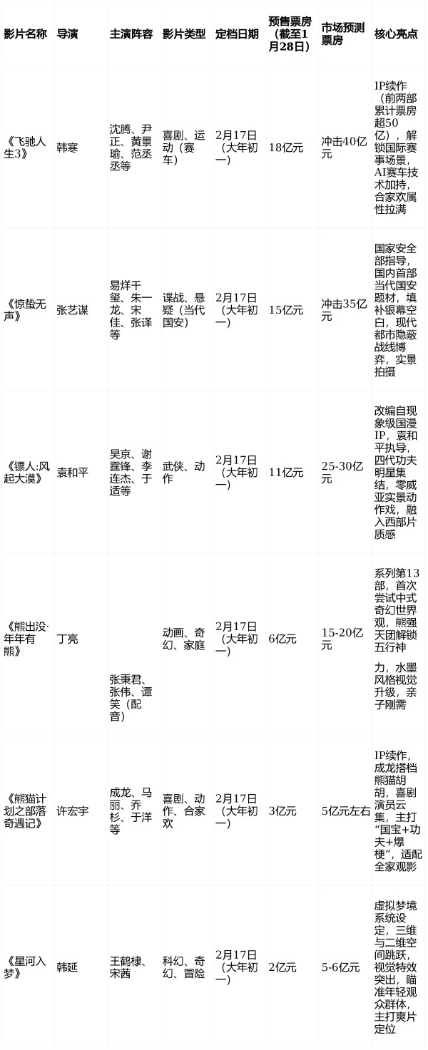 截至2026年1月31日,已有6部影片正式定档2026年贺岁档(春节档核心时段2月17日大年初一上映),涵盖多元类型,集结张艺谋、韩寒、袁和平等名导,沈腾、吴京、易烊千玺等顶流演员,形成“神仙打架”的格局。以下为核心影片详细信息,核心数据均来自灯塔专业版、猫眼专业版及官方官宣。