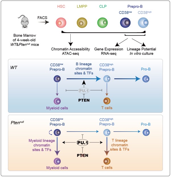 生命科学学院吴虹/李程团队合作揭示PTEN通过PU.1调控造血系统谱系可塑性的细胞和分子机制