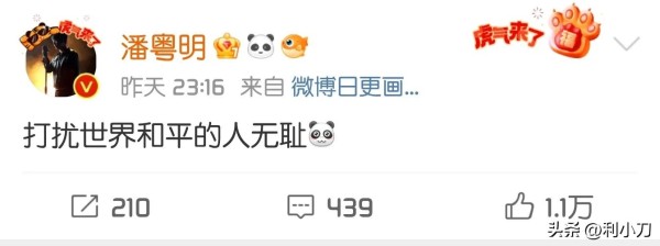 央视新闻微博发出话题后不久,潘粤明没有转发,但是他说了一句话:打扰世界和平的人无耻!一句话已经表明了他的态度和立场,引来大家的好评,这一句话比说千言万语都要真诚!