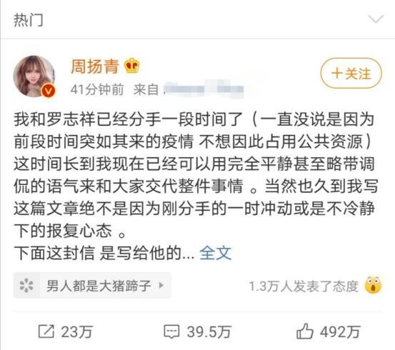 2020年4月,罗志祥被前任女友周扬青出文公布两个人早就提出分手,并爆料罗志祥在与她相处时出轨多的人,一时引起强烈反响。