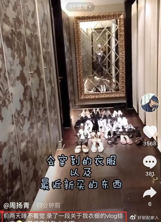 近日,周扬青在社交媒体更新了一段长达4分钟的vlog。视频中,周扬青专门介绍了自己的私人衣帽间,她穿着睡衣出镜,家里的装修富丽堂皇,走复古风;而衣帽间各种款式的衣服、鞋、包包、配饰琳琅满目,是女生们梦想中的衣帽间了。