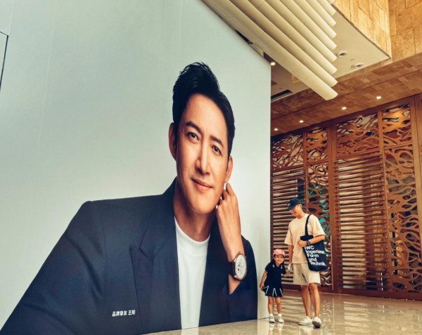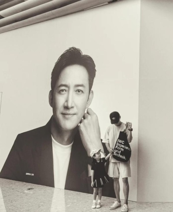 一家三口逛街时还看到了王阳巨型广告牌,看到广告牌上西装革履帅气的爸爸,笑得一脸得意看向镜头的Molly像是在说:“看,我爸爸”,萌态十足。