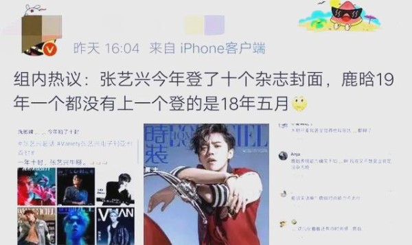 特别是在时尚资源方面,对比同期归国四子中的张艺兴,其19年的时尚封面资源可谓亮眼。张艺兴一年内斩获十张封面,且均为知名时尚杂志,这在男星中已属上乘。而鹿晗,在2019年竟未登上一本杂志的封面。这种对比令人深感落差,鹿晗曾是归国四子中流量领先、资源优越的存在,而如今却仅在一年内拍摄了一个封面。