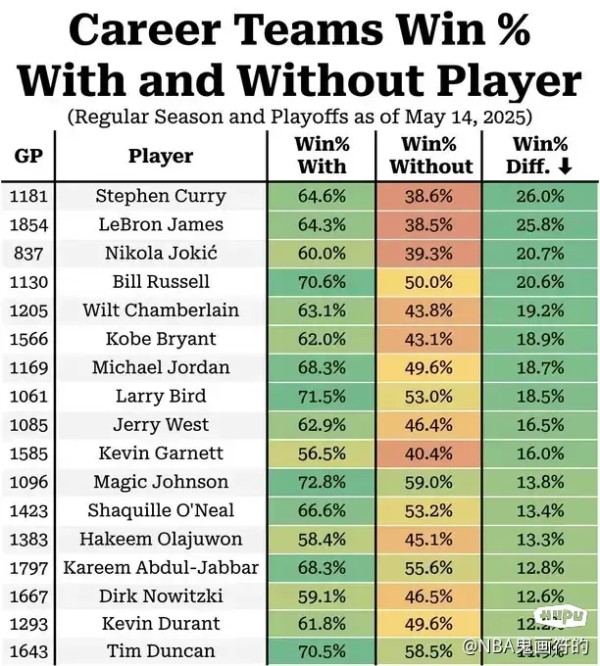 美媒Automatic分享数据:生涯常规赛+季后赛出战时和缺席时球队胜率差;