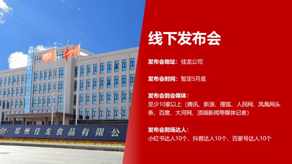 1. 活动阐述:此次新品发布会计划于2022年5月底举行,线下发布会选址佳龙公司,邀请至少10家媒体记者和各平台30位达人到场。线上借助10家权威媒体发布新闻稿,抖音、百度双平台同步直播,100多位达人发布新品内容,同时在抖音、朋友圈、百度三大平台进行广告曝光,并配合电商旗舰店优惠、直播带货和商场试吃活动。