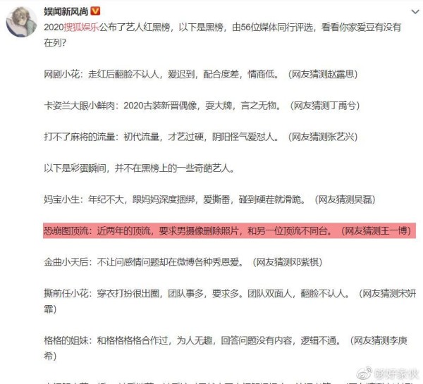 网友解锁!2020媒体眼中的艺人,红榜11人获赞,黑榜恐崩图非王一博?