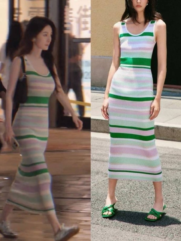 说起来这条裙子能爆火,还得归功于杨幂对“复古元素现代化”的神级演绎。不同于普通吊带裙的单薄,它采用垂坠感极强的混纺面料,走动时裙摆像流动的春水,搭配金属锁骨链和草编包,硬是把十年前的经典款式穿出了“人间薄荷糖”的既视感。有设计师透露,现在工厂都在加急改良面料工艺,原来卖不动的条纹布料突然成了香饽饽,连ZARA都悄悄把这款裙子的预售量提到了十万+。 最有意思的是普通网友的“买家秀惨案”。有人跟风买了平替款,结果要么被绿白条纹穿成“病号服”,要么因为面料太硬变成“行走的麻袋”。时尚博主@穿搭泥石流 吐槽:“以为买的是杨幂同款,结果穿成了菜市场大妈同款”。其实秘密藏在细节里——原版裙子的条纹间距是3.5厘米黄金比例,肩带宽度经过三次调整,连腰线都比普通裙子高2公分,难怪明星穿是“法式慵懒”,普通人穿容易踩雷。