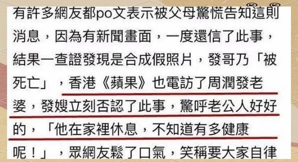 更令人信服的是,有新闻媒体爆出了现场连线发嫂的信息图,使得整个事件更加真实可信。直至发嫂发表声明:“一切安好,请勿担忧。我老公目前状态良好,正在家中静养,身体非常健康。”这一言论才彻底粉碎了这些不实传闻。
