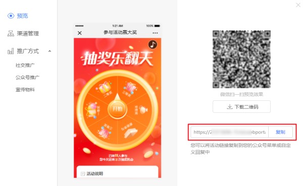 3. 完成活动设置后保存并点击预览,在预览中复制链接,并链接应用到公众号中。