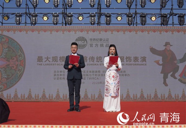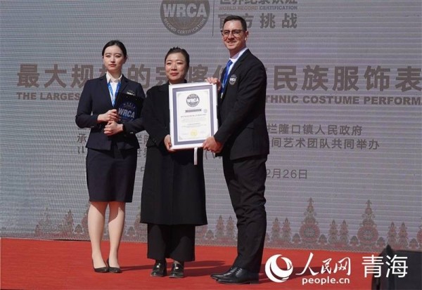 世界纪录认证机构(WRCA)为“最大规模的宗喀传统民族服饰表演”颁发证书。人民网 马可欣摄