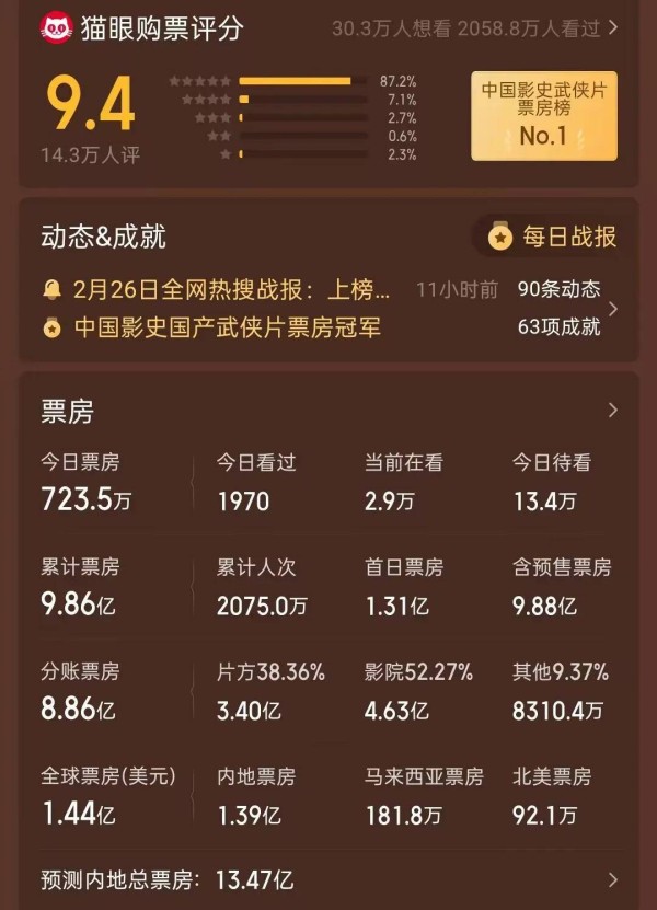 上映十天之后,这部斥资七亿打造的电影累计票房只有9.8亿,猫眼平台为其预测的总票房是13.47亿!