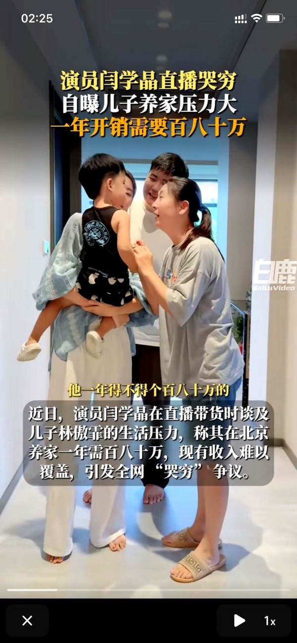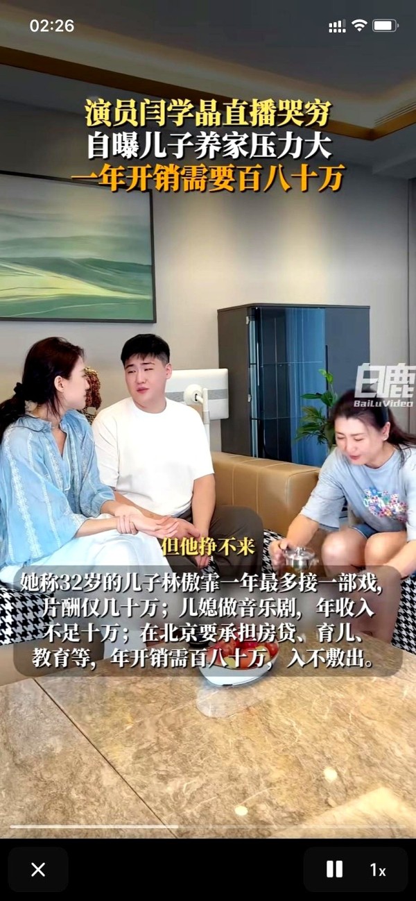 演员闫学晶在12月29号的直播里,直接把大家给说懵了。她替32岁的儿子林傲霏诉苦,说儿子拍戏一年挣二三十万,儿媳搞音乐剧收入不到十万,俩人加起来不到40万。
