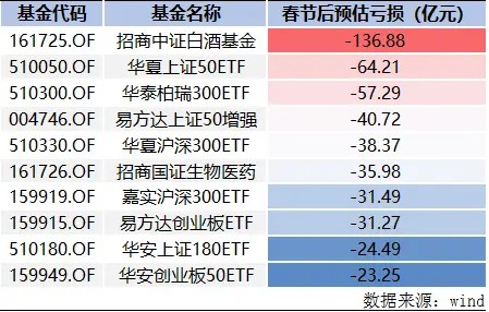 规模较大的招商白酒指数基金估计蒸发130余亿元,华夏上证50ETF估计蒸发60余亿元,华泰柏瑞指数基金预估亏损50余亿元。