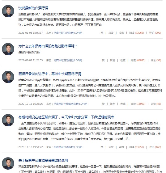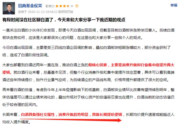 以天天基金网上的中证白酒基金吧里,有一位署名为“招商基金侯昊”的用户,时常在相关论坛发言。