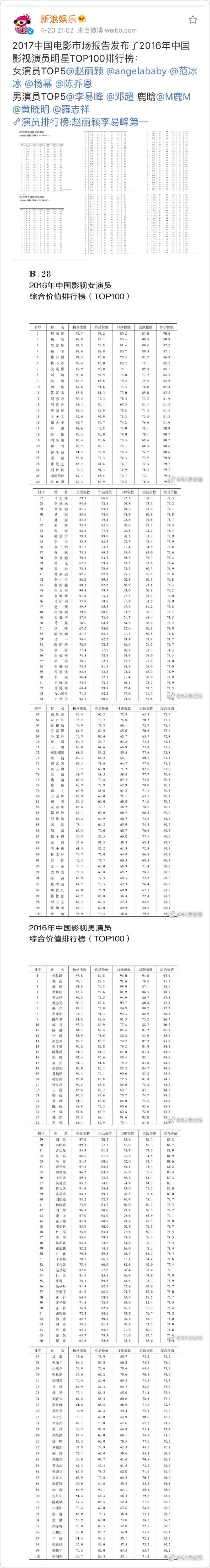 2016中国影视演员排行榜赵丽颖 李易峰各拔头筹,你服吗?