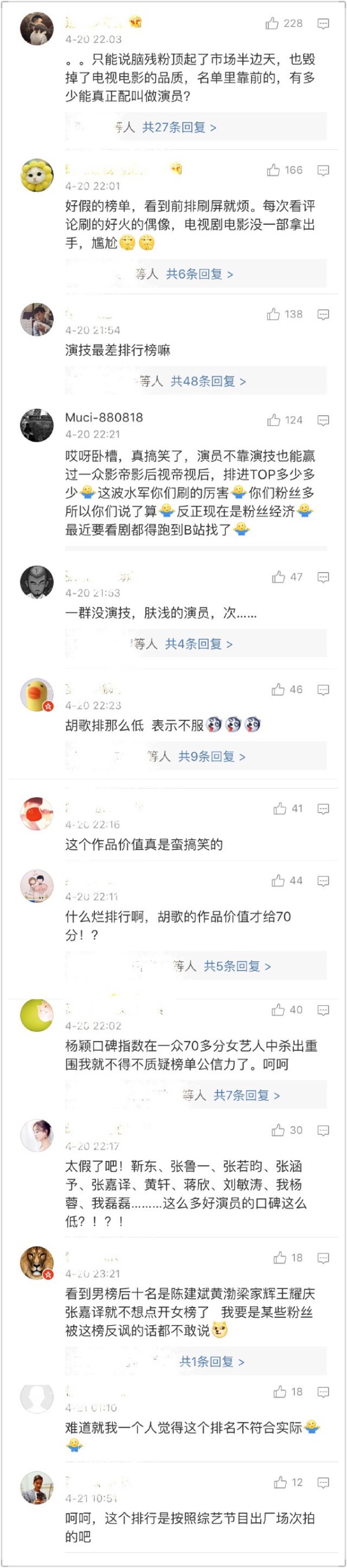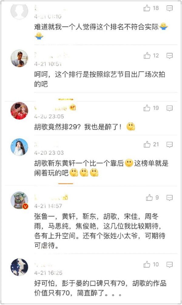 看完这个榜单除了各家的粉丝们开始花式表白,更多的是遭到网友的吐槽和质疑。