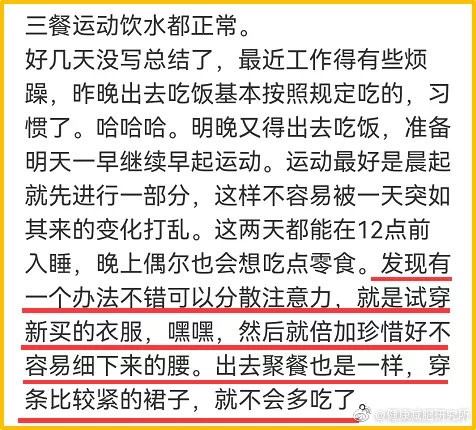 看看小伙伴是怎么说的:发现有一个办法不错可以分散注意力,就是试穿新买的衣服,嘿嘿,然后就倍加珍惜好不容易细下来的腰。出去聚餐也是一样,穿条比较紧的裙子,就不会多吃了。
