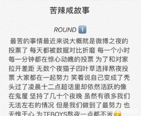 有一位粉丝表示,最苦的事情,大概就是每一次微博之夜以及其他重要的投票以及打榜的投票,所有的四叶草、小螃蟹、小汤圆和千纸鹤们总会在这个时候集体变成夜猫子,在这个时候,所谓的个人看法总是显得没有那么重要了因为每一分钟每一个小时都有着惊人的变化,为了拉开与对方的差距,粉丝宝宝们就算是睡眠不够也一直在不断努力着。