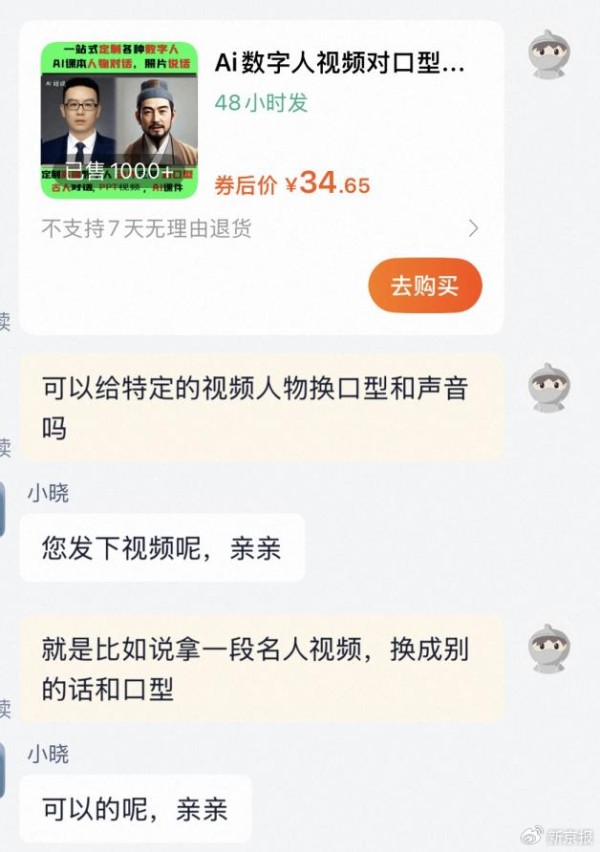 新京报贝壳财经记者在某电商平台咨询得知,多家店铺都支持AI修改明星视频,同时可以在视频上传后不显示“AI生成”的提示,1分钟“魔改”视频的报价在130元-400元不等。如一个“AI数字人(20.250, 0.12, 0.60%)视频对口型”商家显示其服务“已售1000+”。对方表示,支持“拿名人视频换成别的话和口型”。