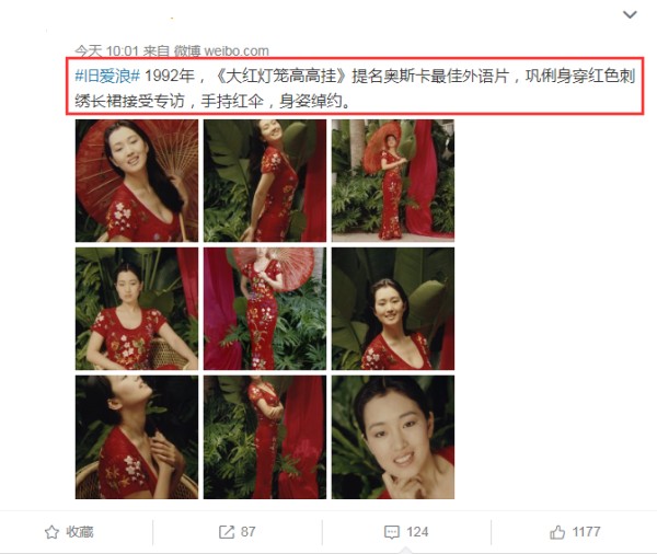第三点是这一组旧照中有巩俐的撑伞妆,巩俐在拍摄这一组写真时用到了油纸伞,巩俐用两只手撑着油纸伞,侧身对着镜头,不仅身材让人羡慕,而且眼神也相当的动人,刚好这一段时间关晓彤的撑伞妆火了,这无疑是偶然地蹭了一波热度,这三个因素捧在一起,巩俐的这一组旧写真想不火都难。