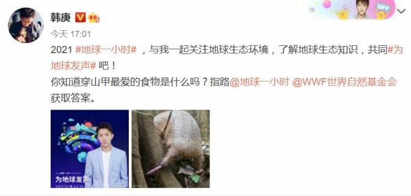 虽然韩庚没有在社交平台回应此事,但事情发生之后,韩庚还是更新了一条动态,不过动态的内容并非与此事有关,而是韩庚以志愿者的身份,发布的一条呼吁保护穿山甲的动态。