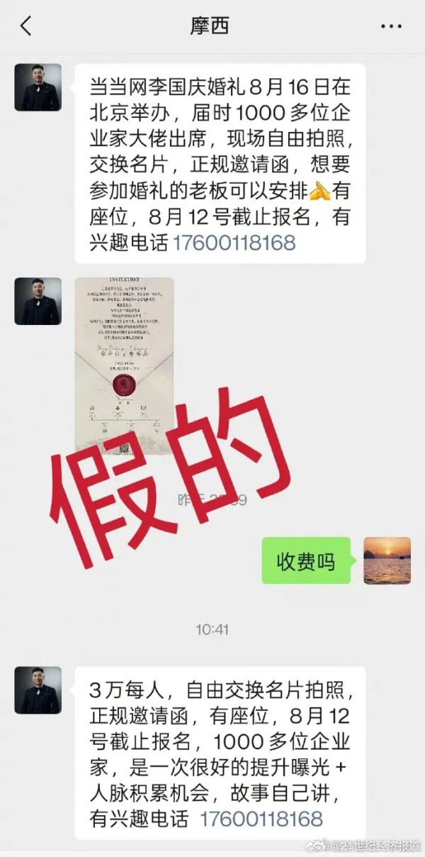 8月13日,《辟谣财知道》注意到,近日有网传截图显示,有网友出售李国庆婚礼门票名额,报价两万元。社交媒体中,一些号称承办明星合影相关业务的账号曾发布类似信息,并称可以在婚礼现场与名人合影、录制VCR等。