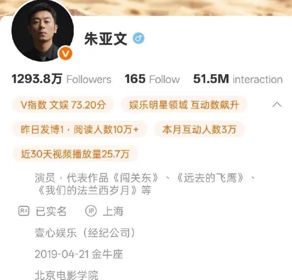 还记得去年《大生意人》热播时,朱亚文的微博简介里,还明晃晃挂着“壹心娱乐”四个字吗? 那时候,他饰演的铁血将军李成,正靠着几场戏份不多的表演,把观众迷得七荤八素,口碑眼看着就要触底反弹。 可谁能想到,这才过了个年,有细心的网友再点开他的主页,发现“经纪公司”那一栏,竟然空了。 没有公告,没有声明,就像一阵风吹过,什么都没留下。 那个曾经在节目里信誓旦旦说着“公司在他在”的男人,和他效力了超过十年的老东家,就这么静悄悄地“分手”了。