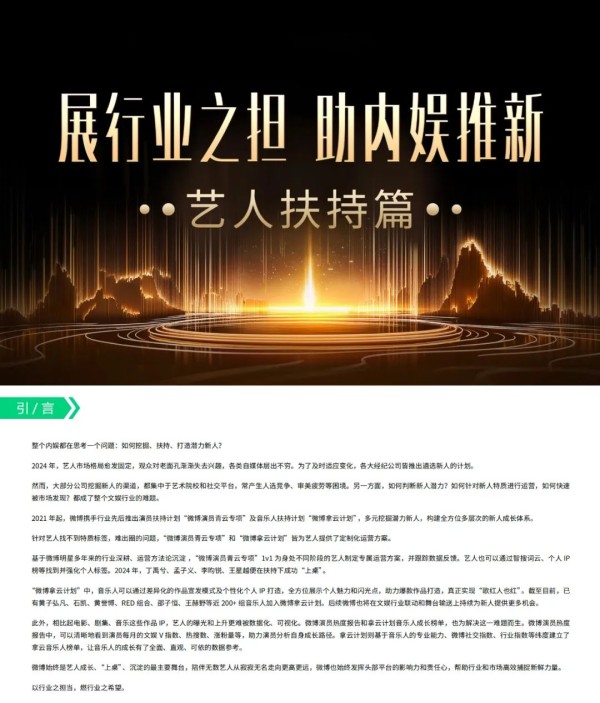 微博始终是艺人成长、“上桌”、沉淀的最主要舞台。2021年起,微博携手行业先后推出演员扶持计划“微博演员青云专项”及音乐人扶持计划“微博拿云计划”,多元挖掘潜力新人,帮助行业和市场高效捕捉新鲜力量。