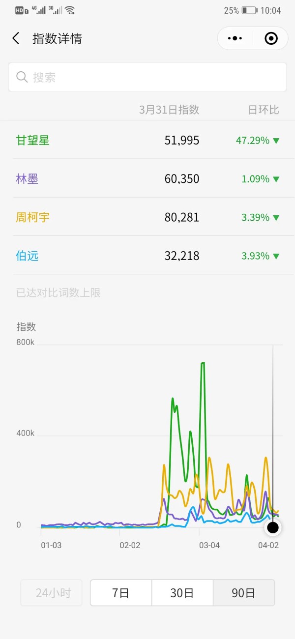 然后是一些学员的微信指数,甘望星前期因为颜值,还是有一些热度的,周柯宇和林墨的热度一直很稳定,伯远在最开始的battle也有一些热度在