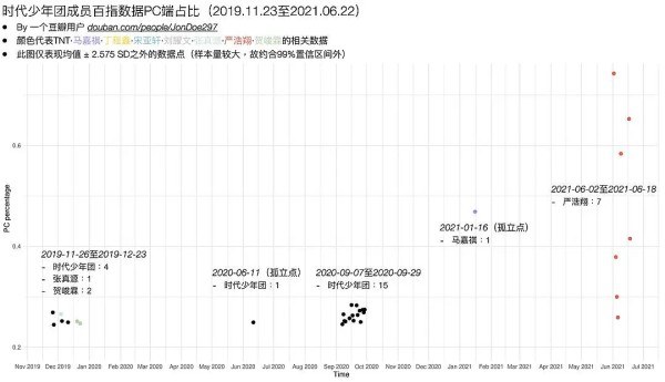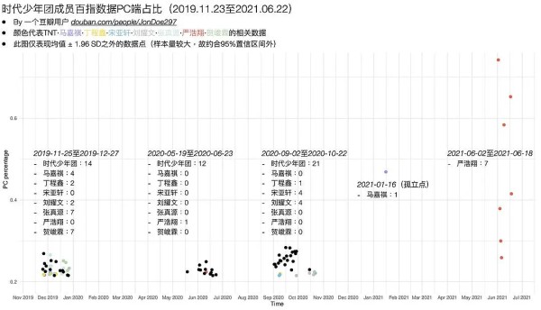 合计:时代少年团(47)> 严浩翔(8)> 张真源(7)= 贺峻霖(7)> 刘耀文(6)> 马嘉祺(5)> 宋亚轩(4)> 丁程鑫(3)可以看出,团体的异常点总数超过成员不少(这从前面的直方图也可以看出)。这也许说明成员与团体的PC端占比应该分开考虑。另外,只有很少几个数据点超过了30%。总体来看,极少有数据点的PC端占比超过了30%,这也从侧面说明,成员们的百度指数都还是比较健康的。