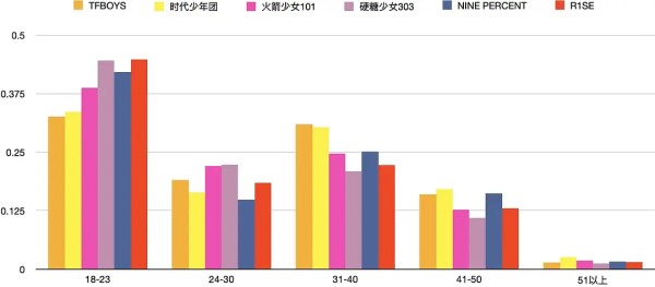 18-23岁:养成系 < 出道早的选秀团体 < 出道晚的选秀团体24-30岁:养成系 = 选秀男团 < 选秀女团31-40岁:出道晚的选秀团体 < 出道早的选秀团体 < 养成系41-50岁:选秀女团 = 出道晚的选秀男团 < 出道早的选秀男团 = 养成系51岁以上:均少(正常结果;这部分噪音也可能比较大)遗憾的是,网站上只提供了比例,未提供具体人数,所以做不了统计检验。