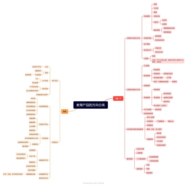 C端教育产品有明确目标的教育学前教育K12教育职业教育考培教育中介式教育投资理财教育通识教育泛知识付费个人通识教育语言教育休闲或兴趣教育老年人教育文娱领域绘画教学陶塑、彩绘、手工等教学烹饪教学体育教育以教育方式进行分类在线课堂在线咨询类线下课堂知识类APP工具型B端教育产品以用户划分企业高校中小学校培训机构在线教育企业用户以功能划分校务管理系统在线学习平台考试与测验系统辅助教学系统实践辅助平台教师培训系统互联网教育产品的分类