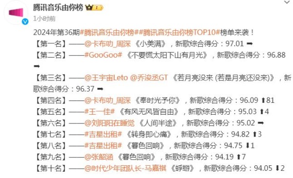 2024年第36期音乐由你榜TOP10榜单来了,周深《小美满》连续登顶,《不要慌太阳下山有月光》继续排在第二位,《若月亮没来》排名也非常稳定,位列第三,周深的《奉时光予你》排在第四位,《有风无风皆自由》排在第五位,小伙伴们喜欢哪首歌曲呢?